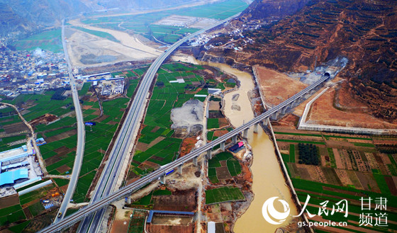 兰渝铁路甘肃陇南境内的汉王特大桥(右)与高速公路及国道交错。(陈斌 摄)