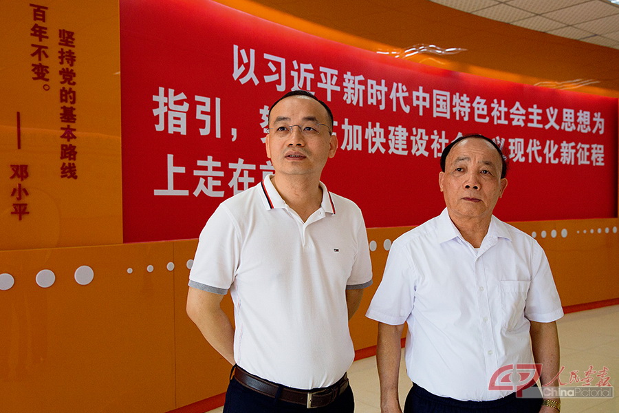 南岭村原党支部书记张伟基(右)与南岭村社区党委书记张育彪。 摄影 陈建/人民画报