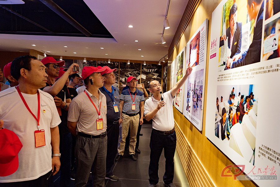 南岭村社区党群服务中心内,来自革命老区的村党支部书记们参观南岭村社区致富思源展览馆,听南岭村社区党委书记张育彪介绍南岭村社区党建经验和经济转型情况。 摄影 陈建/人民画报