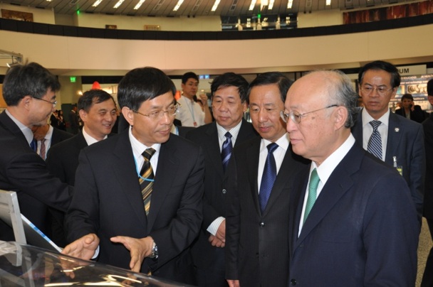 郑明光院长向国际原子能机构总干事天野之弥介绍CAP1400先进性(上海核工院提供)