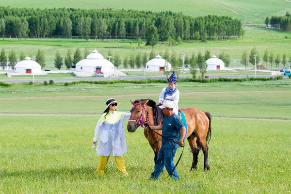 内蒙古通辽,游客在科尔沁草原上骑马游玩