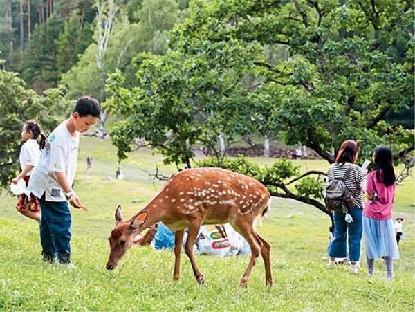 2025年8月5日,正值夏季旅游旺季,游客们在黑龙江省宜春市金山鹿苑的林间草坪上与鹿群亲密互动