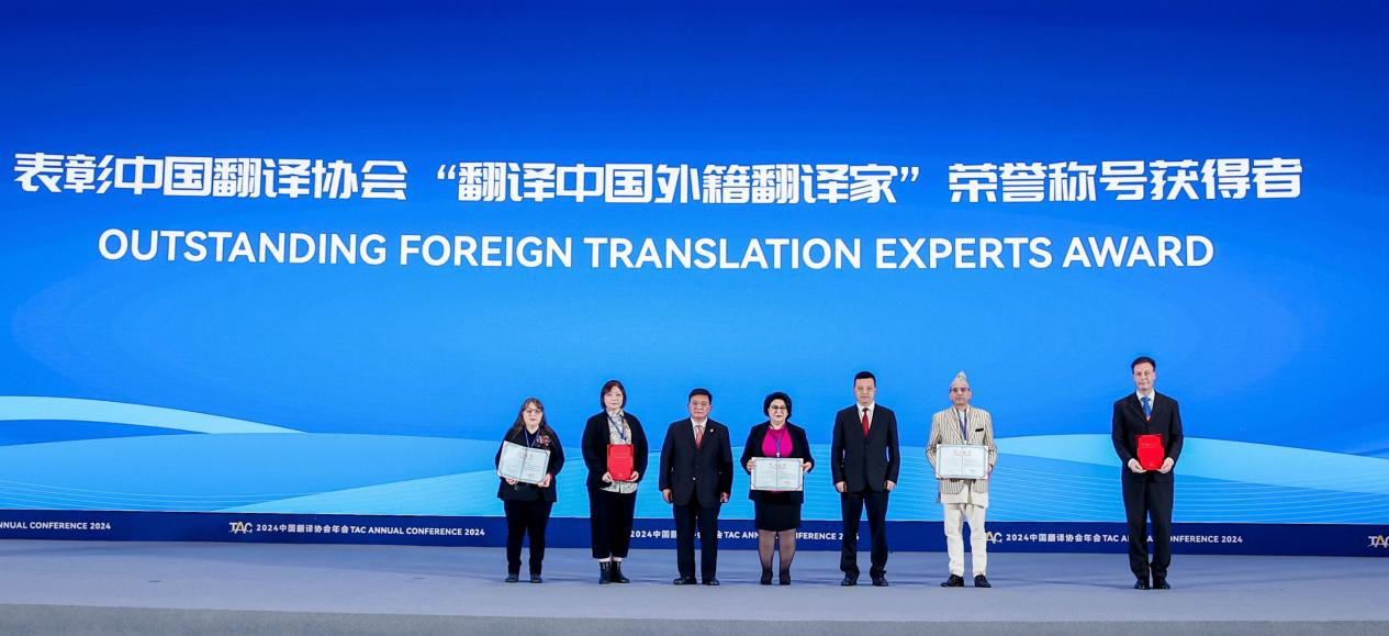“翻译中国外籍翻译家”荣誉称号由中国翻译协会于2022年设立,授予在中国从事翻译相关工作,为讲好中国故事、促进中外交流作出突出贡献的外籍翻译及国际传播专家。该奖项旨在鼓励更多外籍专家从事中译外与国际传播工作,在对外讲好中国故事、传播中国声音方面作出积极贡献。至今已有13位外籍专家获此荣誉称号。2024年,吴漠汀(MARTIN WOESLER)、杰德纳特·阿查里亚(CHET NATH ACHARYA)、法伊萨(KAB FAIZA)、胜又阿雅子(KATSUMATA AYAKO)、葛妮(AGNES BELOTEL-GRENIÉ)、谢麦金(SEMAYKIN EVGENY)、塞萨尔(SANTOS CASTELLANOS CÉSAR MAURICIO)、戴维力(JEAN EDMOND J.DELVIGNE)等8位外籍专家被授予“翻译中国外籍翻译家”荣誉称号。