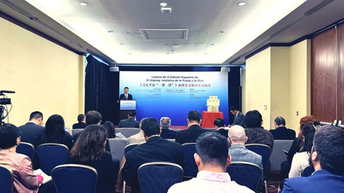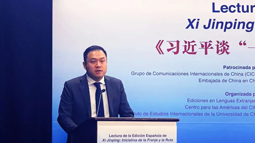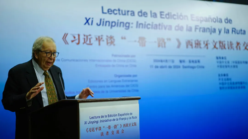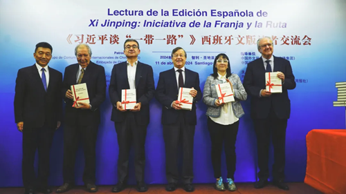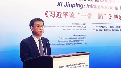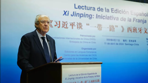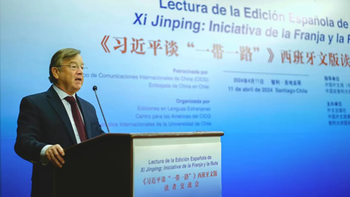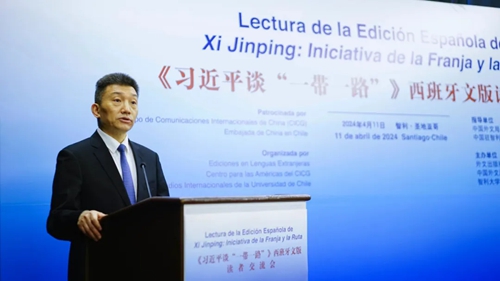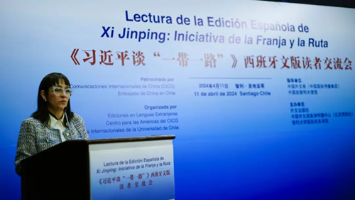 当地时间4月11日上午,由中国外文局、中国驻智利大使馆指导,外文出版社、中国外文局美洲传播中心(北京周报社)、智利大学国际关系学院主办的《习近平谈“一带一路”》西班牙文版读者交流会在智利首都圣地亚哥举行。