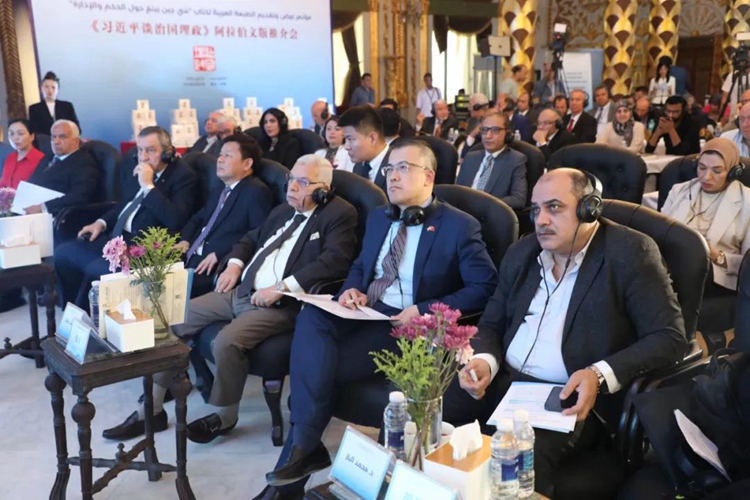 在研讨交流环节,来自中方的外文出版社社长胡开敏、中国驻埃及使馆公使衔参赞赵亮、商务部中国进口博览局副局长李国清、中国外文局欧非中心副主任李五洲、上海外国语大学中东研究所所长丁俊,来自阿方的阿拉伯出版商协会主席穆罕默德·莱沙德、埃及参议院外事委员会副主任萨玛·苏莱曼、埃中友协副主席阿里·希夫尼、埃及宪章报业集团董事长兼总编辑穆罕默德·巴兹、埃及今日消息报业集团董事长依斯拉姆·阿费菲、埃及共产党总书记萨拉赫·阿德利、埃及社会主义党总书记艾哈迈德·沙班等中埃嘉宾围绕《习近平谈治国理政》展开深入交流。