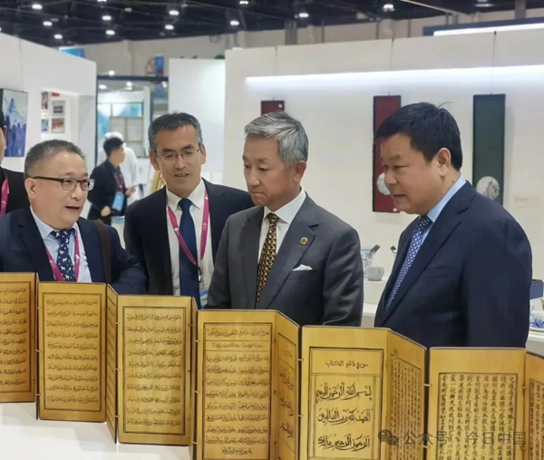 中国外文局局长杜占元(右)和中国驻阿联酋大使张益明(右二)在“今日中国非遗馆”展台,观看非遗产品竹刻《古兰经》