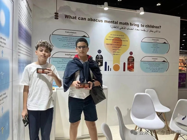 “今日中国非遗馆”中,两位阿拉伯少年被中国算盘吸引