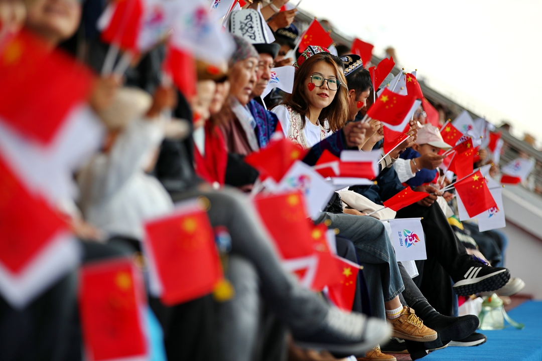开赛仪式上热情挥舞国旗和运动会会旗的观众。