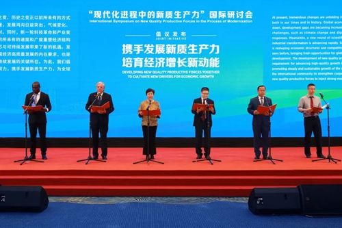 研讨会上,中外嘉宾代表发出“携手发展新质生产力,培育经济增长新动能”共同倡议。倡议指出,发展新质生产力不仅是推动中国经济高质量发展的内在要求,也是促进世界经济稳定增长与可持续发展的关键所在。倡议呼吁:坚持以科技创新为引领,共筑跨国科技创新共同体;坚持以产业转型升级为抓手,深化产业链供应链务实合作;坚持以绿色低碳发展为导向,携手推进发展方式创新;坚持以规则标准衔接为牵引,共建公正合理高效的全球合作机制;坚持以发展成果共享为愿景,推动技术进步红利惠及各国人民。