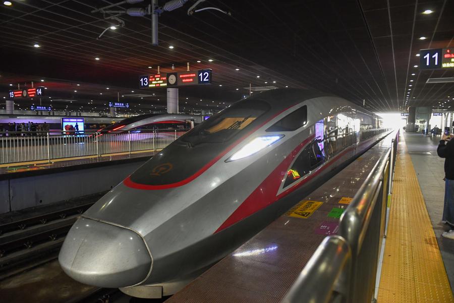 1月12日,前往香港西九龙的高铁驶入深圳北站站台。新华社记者 毛思倩 摄
