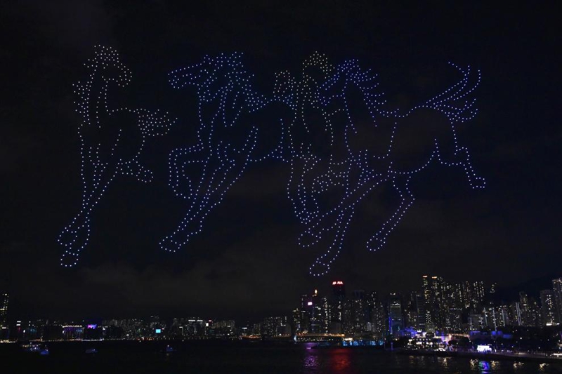 随后,以徐悲鸿四幅画作为灵感的图案首次呈现在维港上空,表达对国家与香港昌盛发展的美好祝愿。