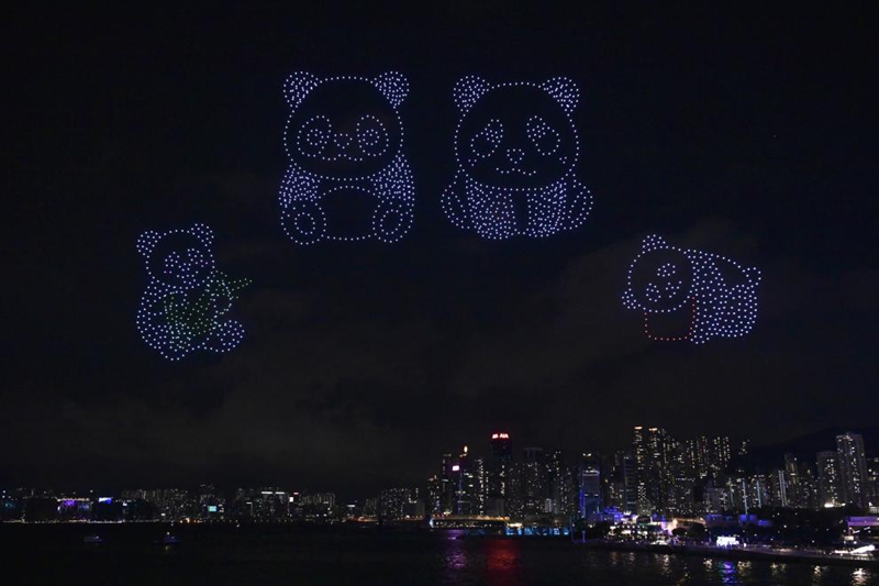 以夜为幕,以光为笔。当晚8时许,伴随着《东方之珠》的歌声,无人机从香港湾仔海滨腾空而起,生动演绎了香港从小渔村发展成国际大都会波澜壮阔的发展历程:天星小轮在“海面”上漂泊、带有“叮叮”声的“叮叮车”徐徐前行,渔村等充满香港特色的图案活现眼前,让观众感受到“东方之珠”的无限魅力。